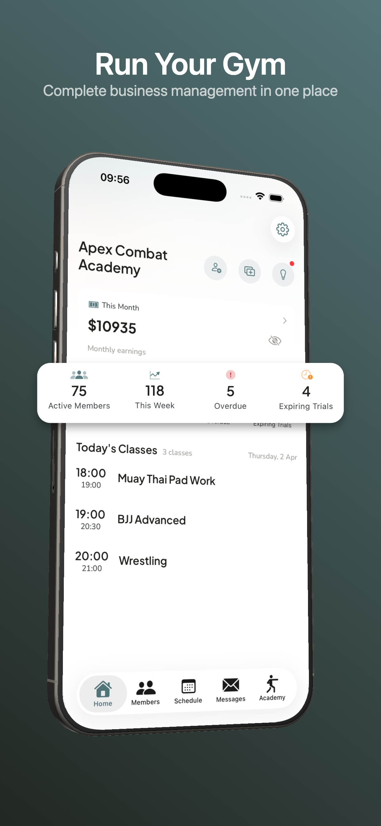 Members, schedules, attendance, billing — the management app for martial arts academies, CrossFit boxes, and yoga studios.